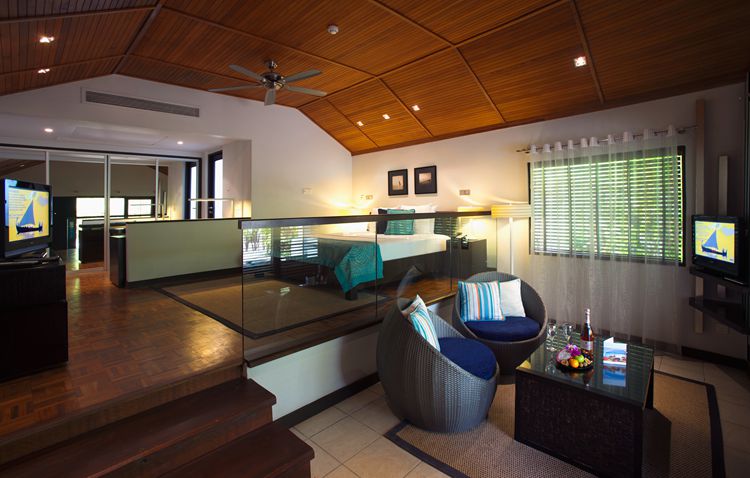 所有的别墅与客房均与自然融为一体,宽敞而温馨,拥有绝佳的视野观赏海景。沙滩别墅隐藏在葱葱郁郁的热带植物里,门前即是沙滩,拥有户外阳台、沙发床和户外淋浴区。水上别墅矗立在礁湖上,以水上木板步道连接,绝佳的隐密性,拥有私人的甲板并有楼梯可直接入水,也可全观而无屏障的视野。