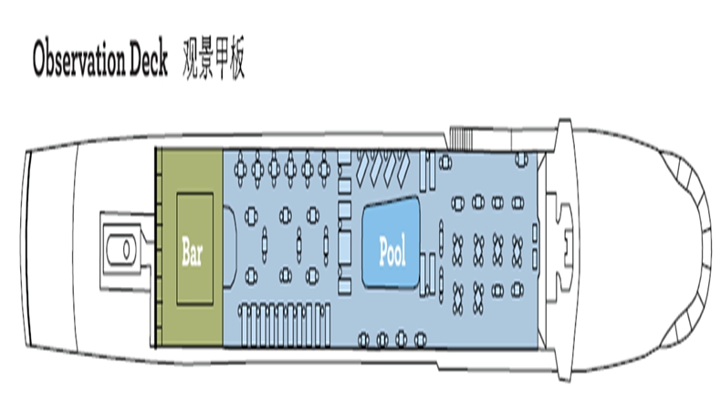 主甲板:餐厅,酒吧,观景休息室(图书角放置各种语言的书籍和游戏),精品店