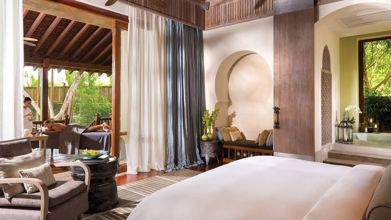 在室外用餐休息区享用特调饮品,或饱览安达曼海的绚丽景观,同时照看在前方葱郁草坪及沙堆区欢快玩耍的孩子。这些单卧室寓所是唯一直接通向沙滩的亭楼,是年轻家庭的完美选择。每个单元均位于传统双层马来式亭楼的底层,空间宽敞。您的卧室位于海滩的静谧之处,出门便是您的私人露台,是享用美味早餐、俯瞰安德曼海的理想之地。室内外连通式双浴室十分宽敞,室内配备土耳其式水磨石浴缸,室外则是花洒淋浴室。
