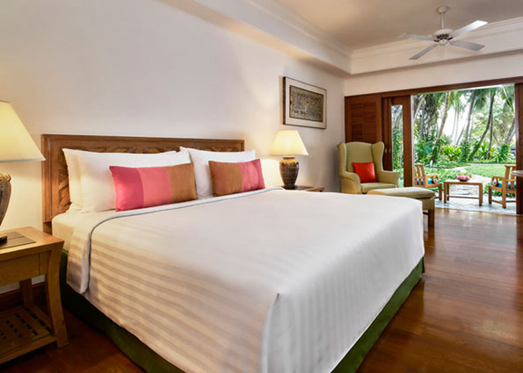 园景露台单间拥有一个私人入口,白色廊柱、郁郁葱葱的热带植物和独特的泰国佛像为房间增色不少。在景观花园环抱的露台上用餐,可俯瞰游泳池和充满异域风情的莲池。在舒适豪华的房间内放松身心,大理石浴室的圆顶天窗让自然光线洒满室内,可谓客房的一大亮点。