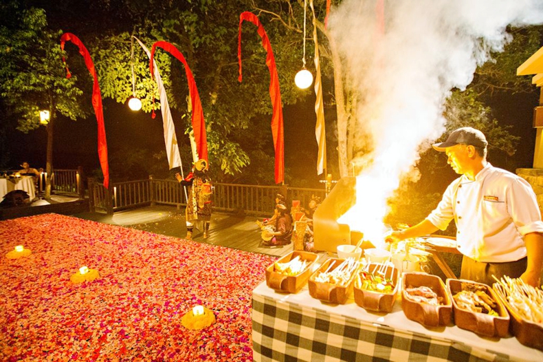 您的私人别墅将被布置成以白色为基调(代表纯洁的颜色),用传统旗帜,巴厘岛洋伞、热带花瓣、百余只蜡烛作为装饰,再加上一点点传统巴厘岛 Gender 音乐。这时,开始美味的巴厘岛大餐,明亮的月光也将给您带来众神的祝福。餐厅服务生将为您换上白色的巴厘岛传统服饰,这也代表着心灵的净化。