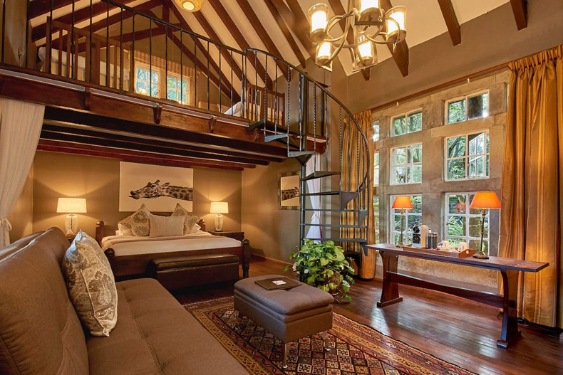 ▶芬奇·哈顿套房(Finch Hatton Suite): 卧室面积约为40平方米。从一楼餐厅旁边进入,没有长颈鹿喂食通道。一楼为双人床,阁楼层为两张单人床(仅适用于儿童),可通过螺旋楼梯进入,有室内壁炉和带双淋浴和浴缸的套房浴室。