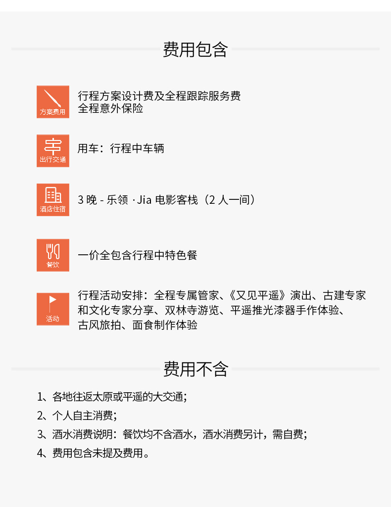 行程活动安排:全程专属管家,《又见平遥》演出,古建专家和文化专家分享,双林寺游览,平遥推光漆器手作体验,古风旅拍,面食制作体验。